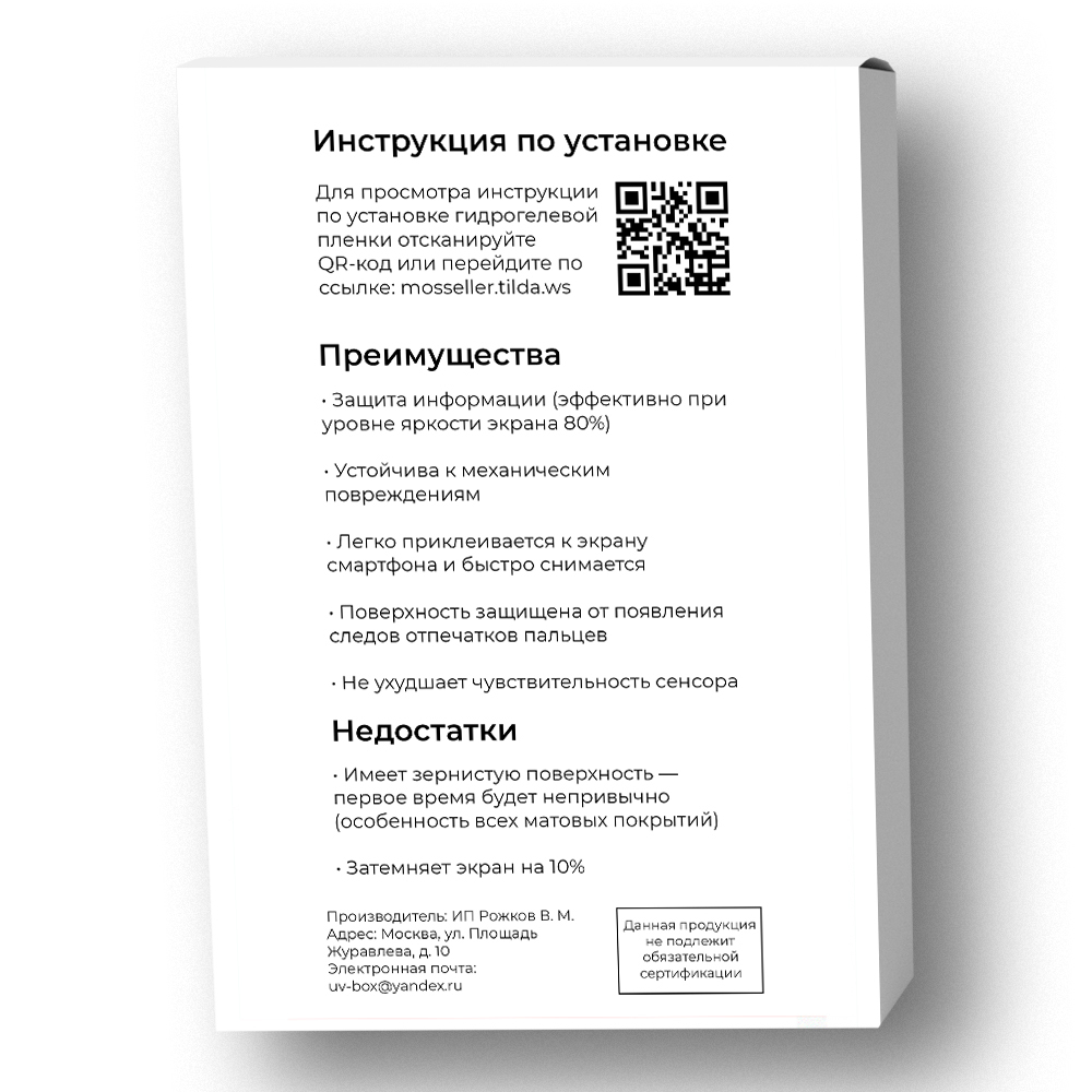 Перед установкой (наклеиванием) гидрогелевой пленки MosSeller Антишпион необходимо ознакомиться с видео-инструкцией! Антишпион гидрогелевая пленка MosSeller для Vivo X80 Lite глянцевая создана из полимерного материала, поглощающего и удерживающего влагу. Она обладает высокой прочностью, способна защитить экран смартфона от появления царапин и потертостей. Преимущества гидрогелевой плёнки Антишпион: Защита информации (содержимое экрана не видно сбоку). Устойчива к механическим повреждениям. глянцевая поверхность защищена от появления следов отпечатков пальцев. Легко приклеивается к экрану телефона, и быстро снимается. Не ухудшает чувствительность сенсора. Дополняется идеальными вырезами под динамик, среднюю кнопку (если они есть на экране). Не выделяет вредные вещества, абсолютно безопасна. Долговечная в эксплуатации. Толщина 0.15мм. Доступная цена. Недостатки: Затемняет экран на 10%. Отличительная особенность гидрогелевой плёнки от обычной защитной пленки или стекла — свойство самовосстановления поверхности. Незначительные царапины полностью «затягиваются» в течение суток. Глубокие уменьшают, но не исчезают на 100%. Изображения на экране отлично просматриваются. Пленка MosSeller Антишпион не высыхает на воздухе и под действием ультрафиолета. Обладает высокой износостойкостью, сохраняя первичные свойства на протяжении всего срока эксплуатации. Ухаживать за плёнкой весьма просто. Поскольку на ее поверхности не остаются отпечатки пальцев, очистить ее можно при помощи обычных салфеток или мягкой тряпки.