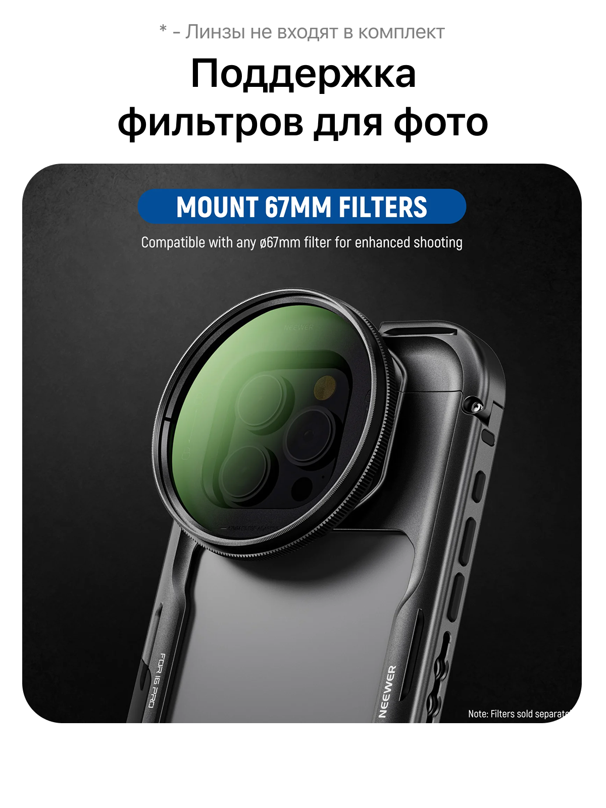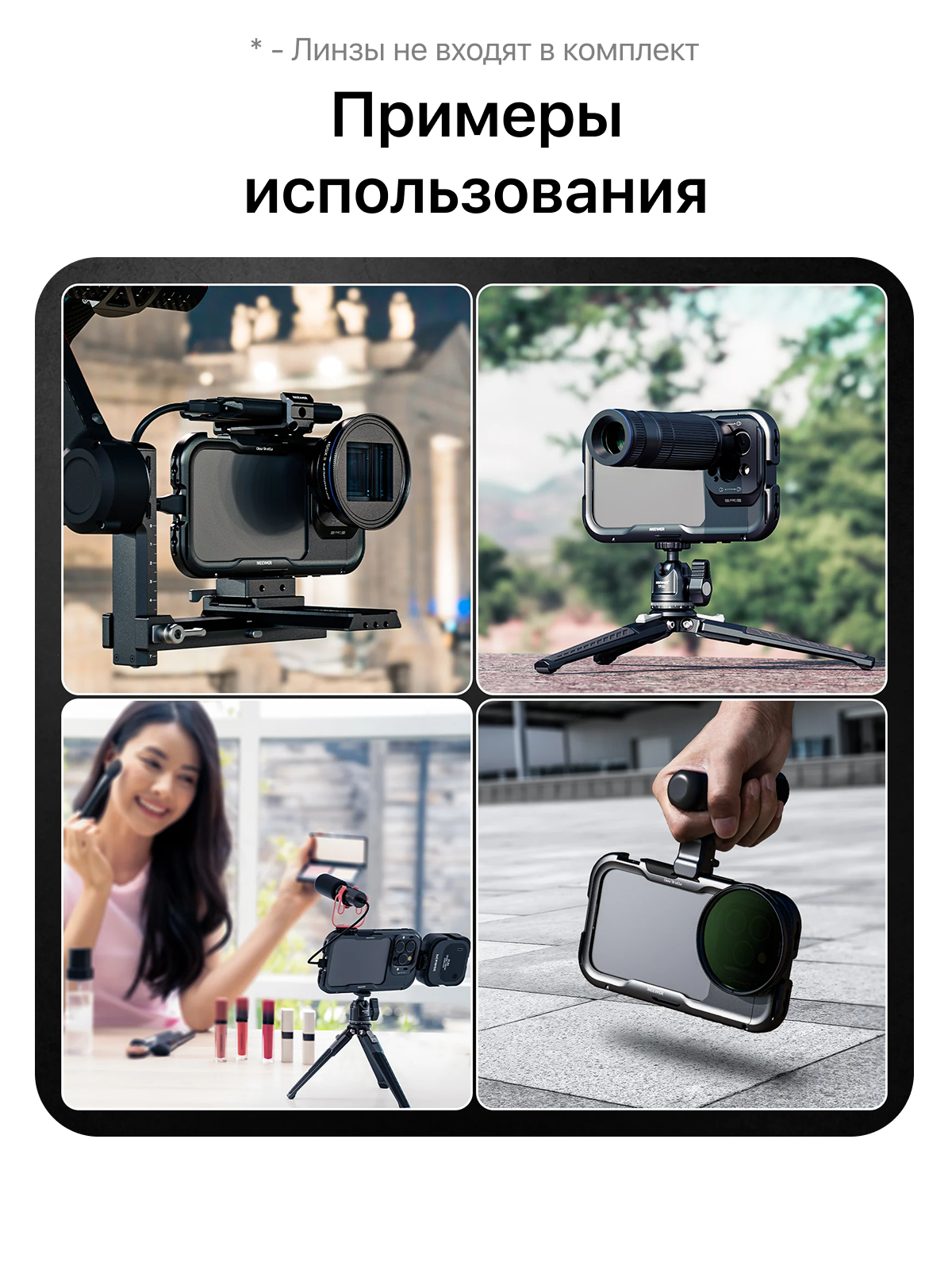 Чехол оснащён системой крепления для сменных объективов, что позволяет использовать профессиональную оптику и фильтры без потери качества изображения. Идеальная геометрия посадки гарантирует точную соосность объектива с камерой смартфона, исключая искажения и виньетирование.