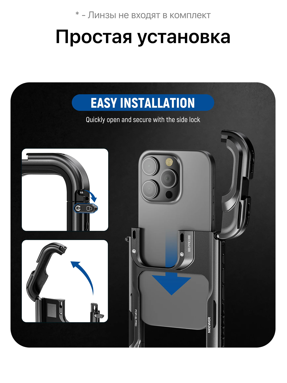 Профессиональный алюминиевый чехол NEEWER PA074 создан для тех, кто использует iPhone 16 Pro Max как полноценный инструмент фото- и видеосъёмки. Прочная цельнометаллическая конструкция обеспечивает надёжную защиту смартфона и одновременно расширяет его функциональность, превращая устройство в мобильную камеру продвинутого уровня.