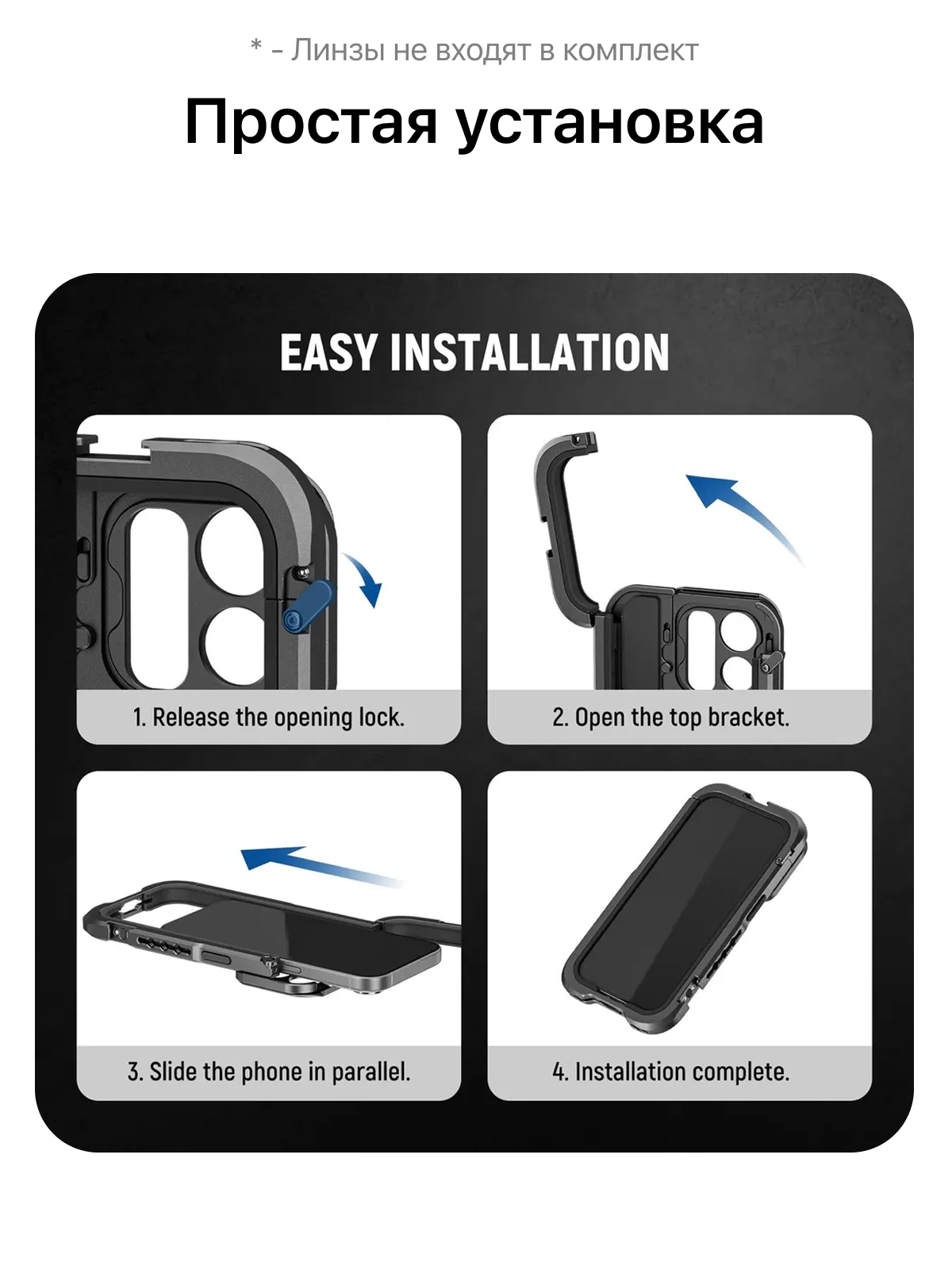 Чехол оснащён системой крепления для сменных объективов, что позволяет использовать профессиональную оптику и фильтры без потери качества изображения. Идеальная геометрия посадки гарантирует точную соосность объектива с камерой смартфона, исключая искажения и виньетирование.