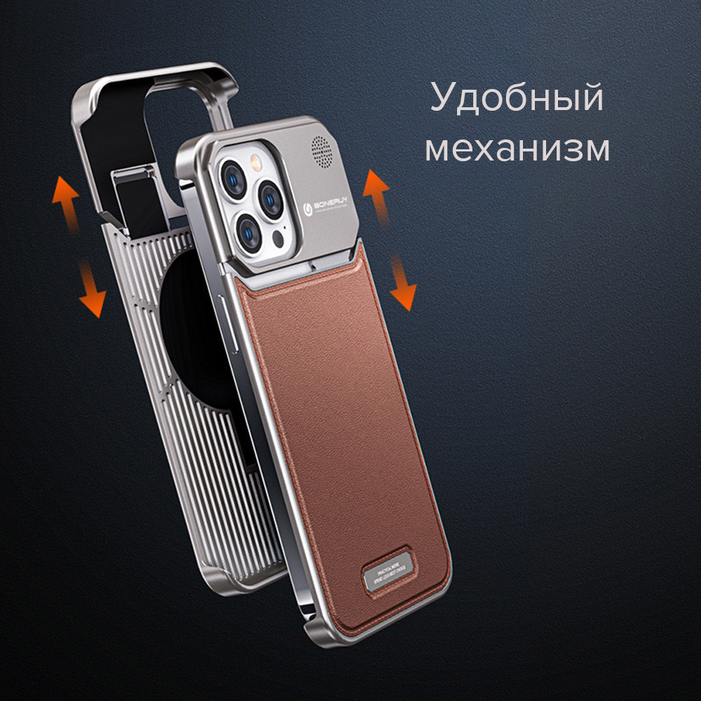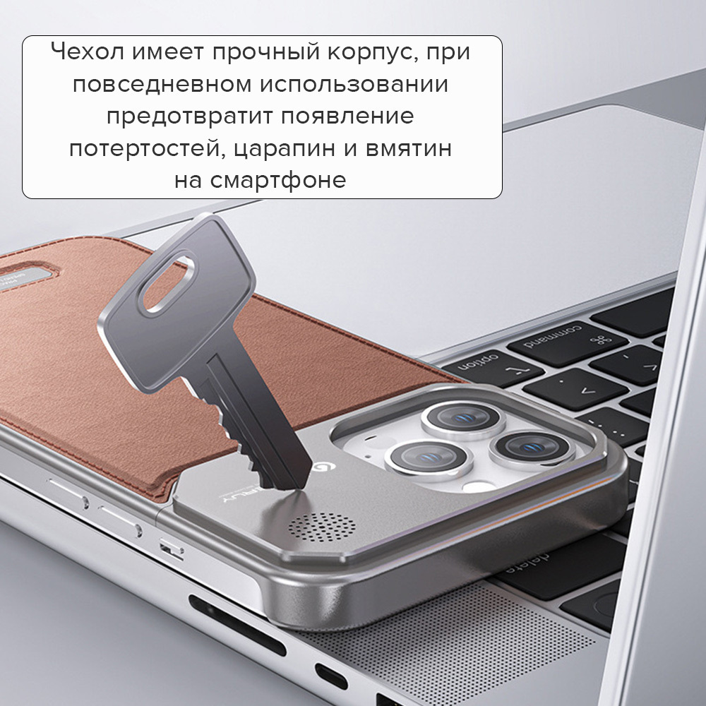 Стильный и надёжный чехол для вашего Apple iPhone 15 Pro Max. Он изготовлен из комбинации алюминия и кожи, что обеспечивает ему прочность и долговечность. Чехол защищает ваш телефон от царапин, сколов и других повреждений, сохраняя его в отличном состоянии на долгое время.