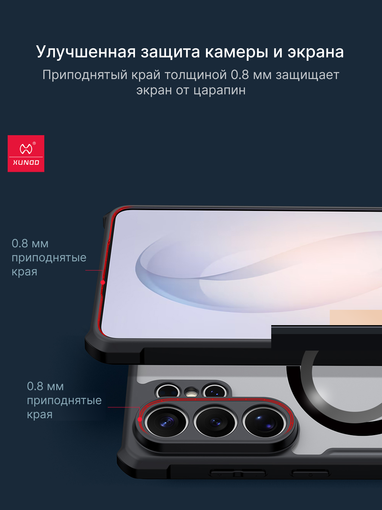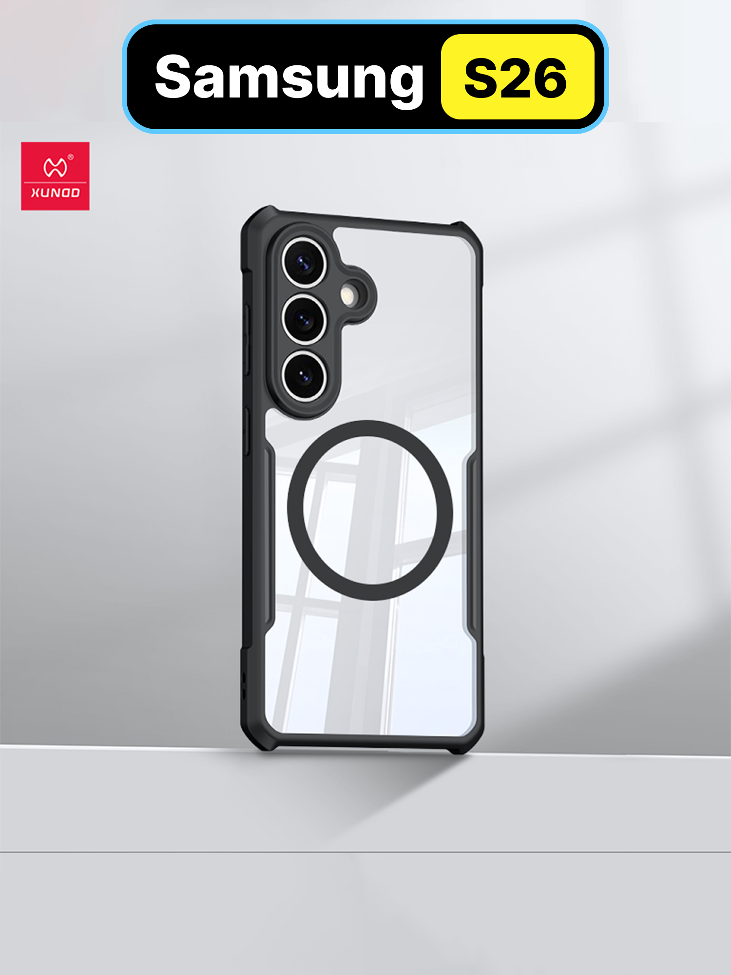 Чехол для Samsung Galaxy S26 c Магсейф изготовлен из поликарбоната и термопластичного полиуретана. Задняя панель абсолютно прозрачная и не скрывает цвет смартфона. Чехол-бампер имеет усиленные углы с "воздушной подушкой", способные принять на себя удар. Простая и надежная конструкция чехла обеспечивает безопасное и комфортное использование смартфона. Противоударный чехол изготовлен специально под модель телефона Samsung Galaxy S26, благодаря чему плотно надевается, соответствуя всем изгибам, разъёмам и кнопкам устройства. Главная его особенность заключается в усиленных углах: между углами чехла и телефона образуется воздушная подушка, амортизирующая при ударах и падениях. Бортики выступают над дисплеем и модулем камер, тем самым дополнительно их защищая, ещё больше снижая вероятность появления сколов и царапин. Сам чехол сделан из упругого, гибкого и износостойкого материала.