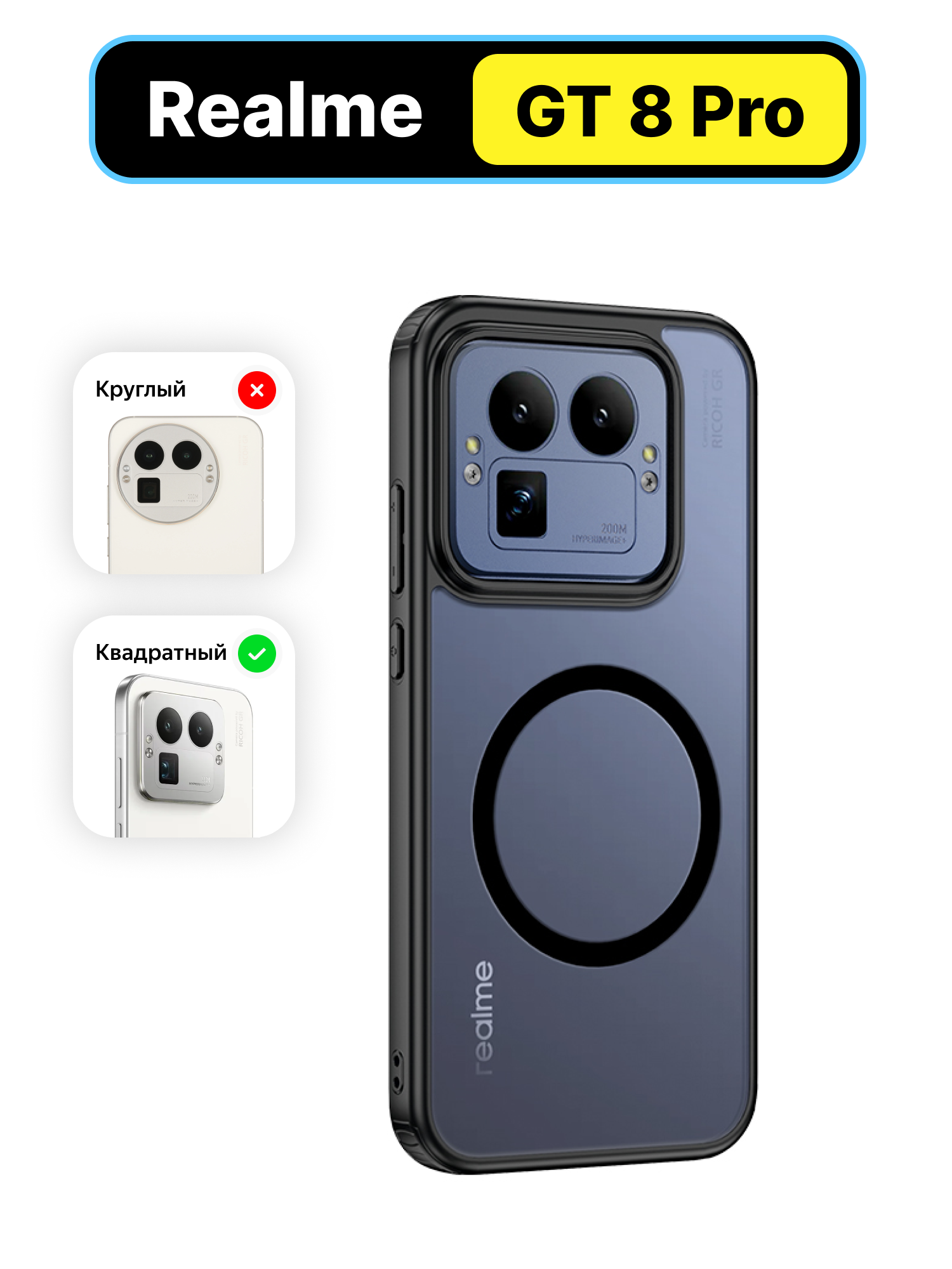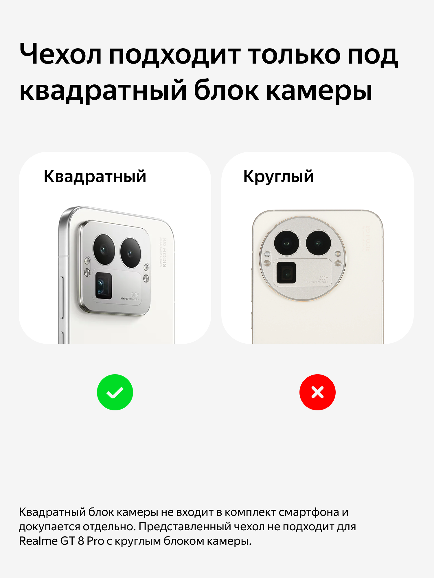 Чехол подходит только под квадратный блок камеры. Квадратный блок камеры не входит в комплект смартфона и докупается отдельно. Представленный чехол не подходит для Realme GT 8 Pro с круглым блоком камеры.