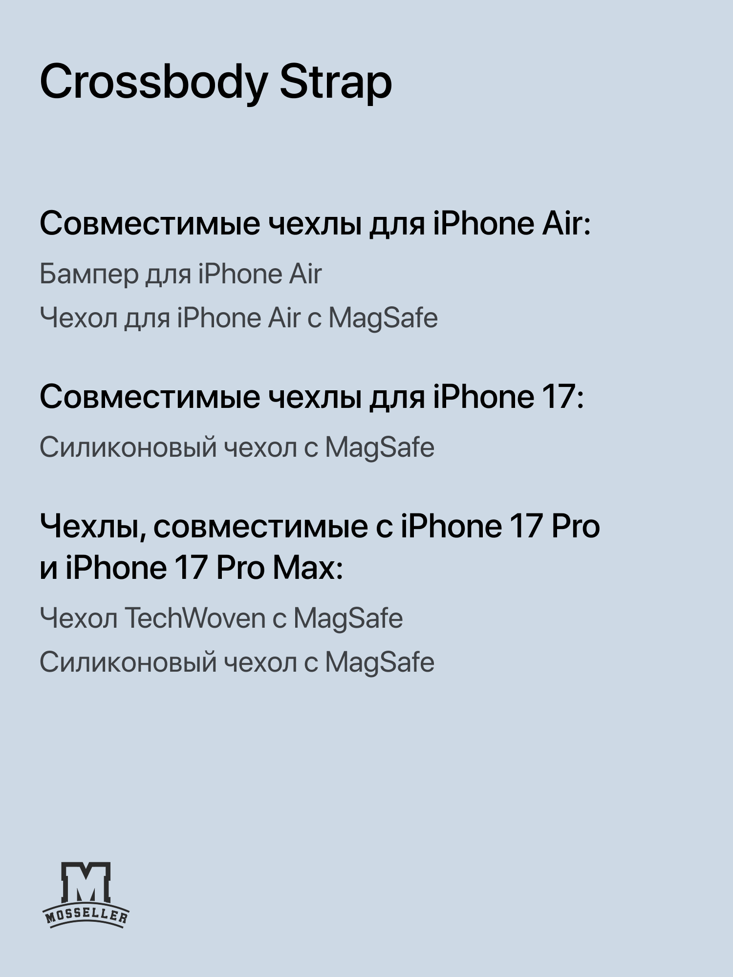 Ремешок Crossbody предназначен для крепления к совместимым чехлам Apple, обеспечивая удобный и освобождающий руки способ носить iPhone.