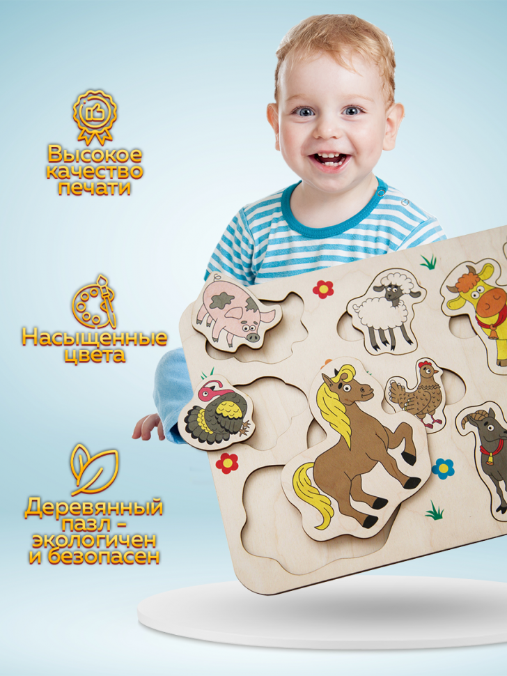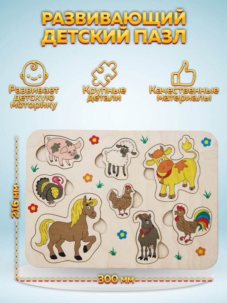 Каждому ребенку необходимы развивающие игры, и пазл-вкладыши "Животные" будет отличным помощником в развитии малыша. Решите головоломку из 8 деталей, сопоставив формы или изображения с правильными отверстиями. Произносите с ребенком названия животных во время игры. Идеальная игрушка для маленьких пальчиков. Ребенку удобно играть с каждым элементом игрушки. Обучение названиям животных. Дети узнают больше о животных, с которыми они могут столкнуться в повседневной жизни, с помощью этой красочной и увлекательной головоломки. Развивает у детей мелкую моторику и координацию рук и глаз. Пазл изготовлен из безопасных для детей и прочных материалов, гарантирующих, что это игрушка, которую ваш ребенок будет любить долгие годы. Изображения напечатаны на фанере, а не наклеены, что повышает срок службы изделия. Размер изделия 300мм*216мм.
