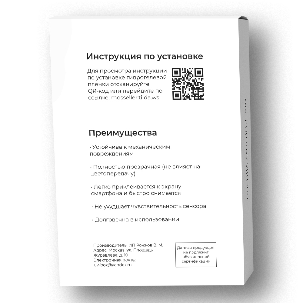 Гидрогелевая пленка 1шт; комплект для установки 1шт; фирменная паковка 1шт; ракель 1шт.