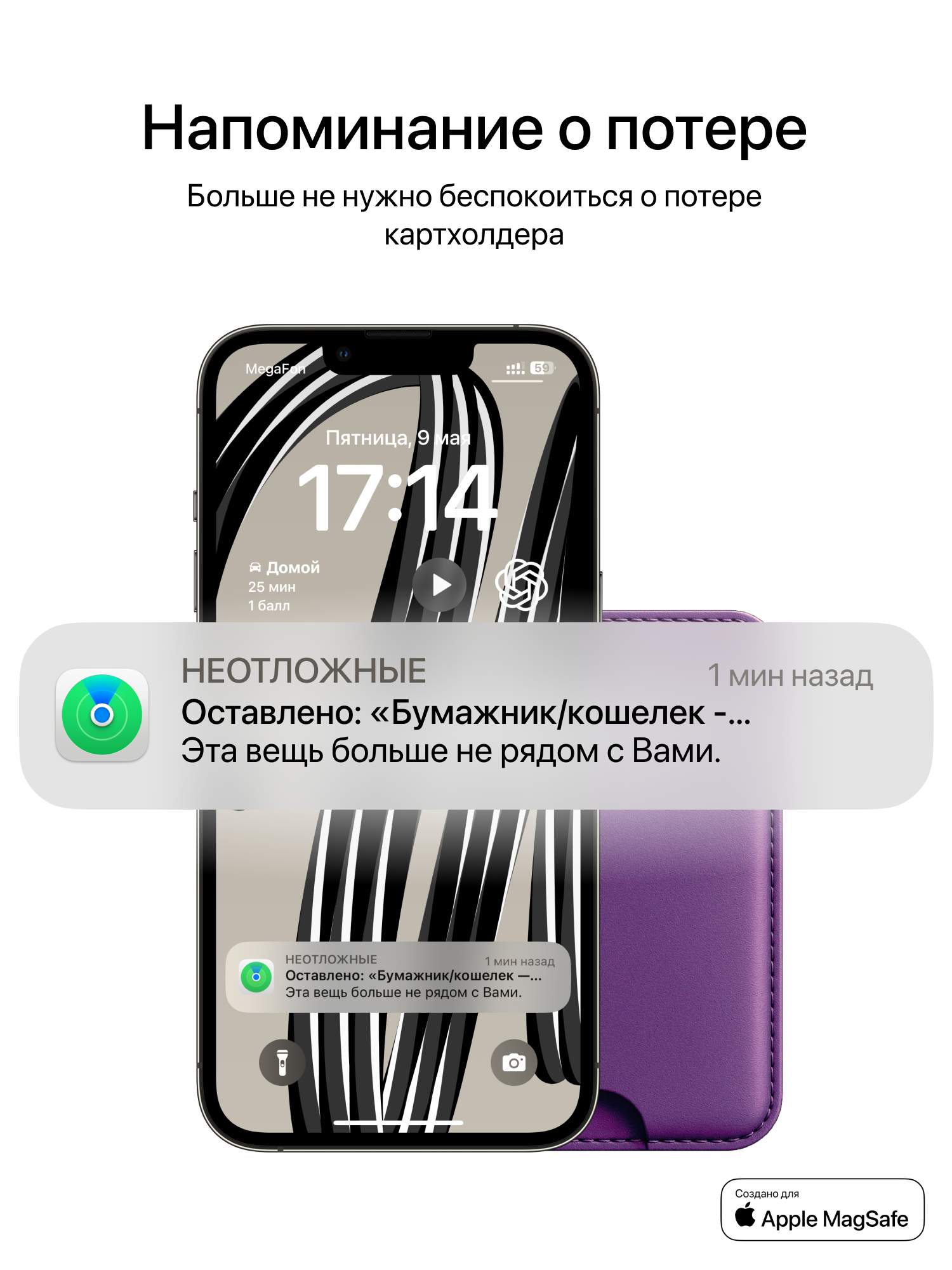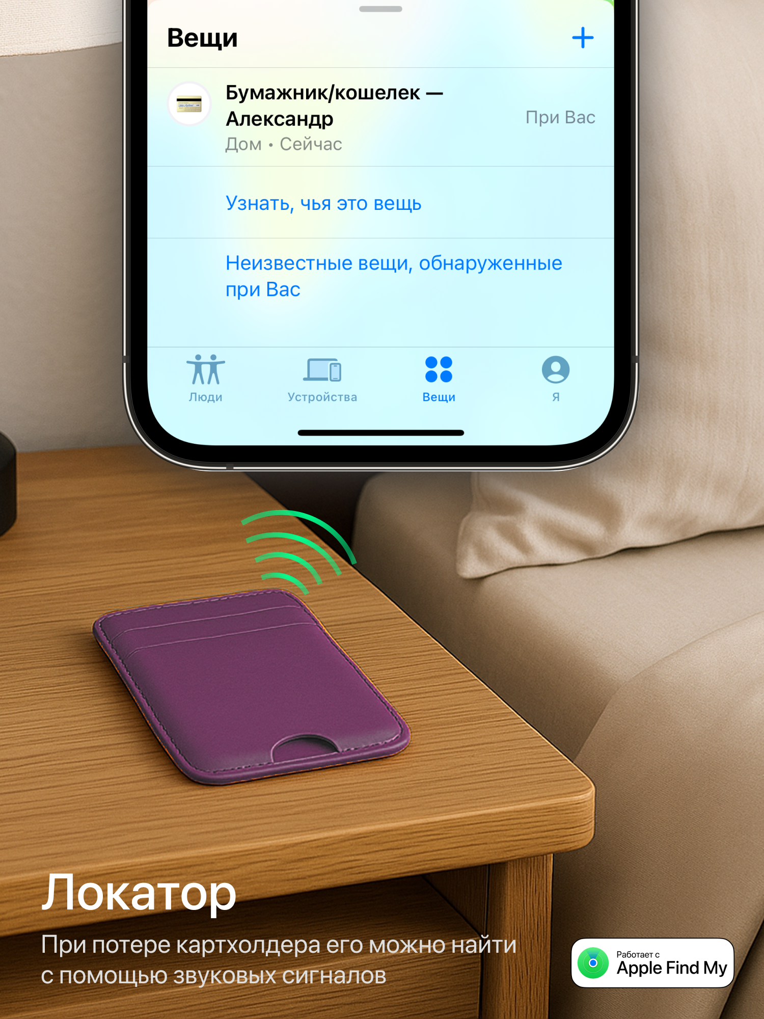 Этот картхолдер поддерживает технологию Apple Find My (Локатор) — вы всегда сможете отследить его местоположение через приложение, если потеряете.