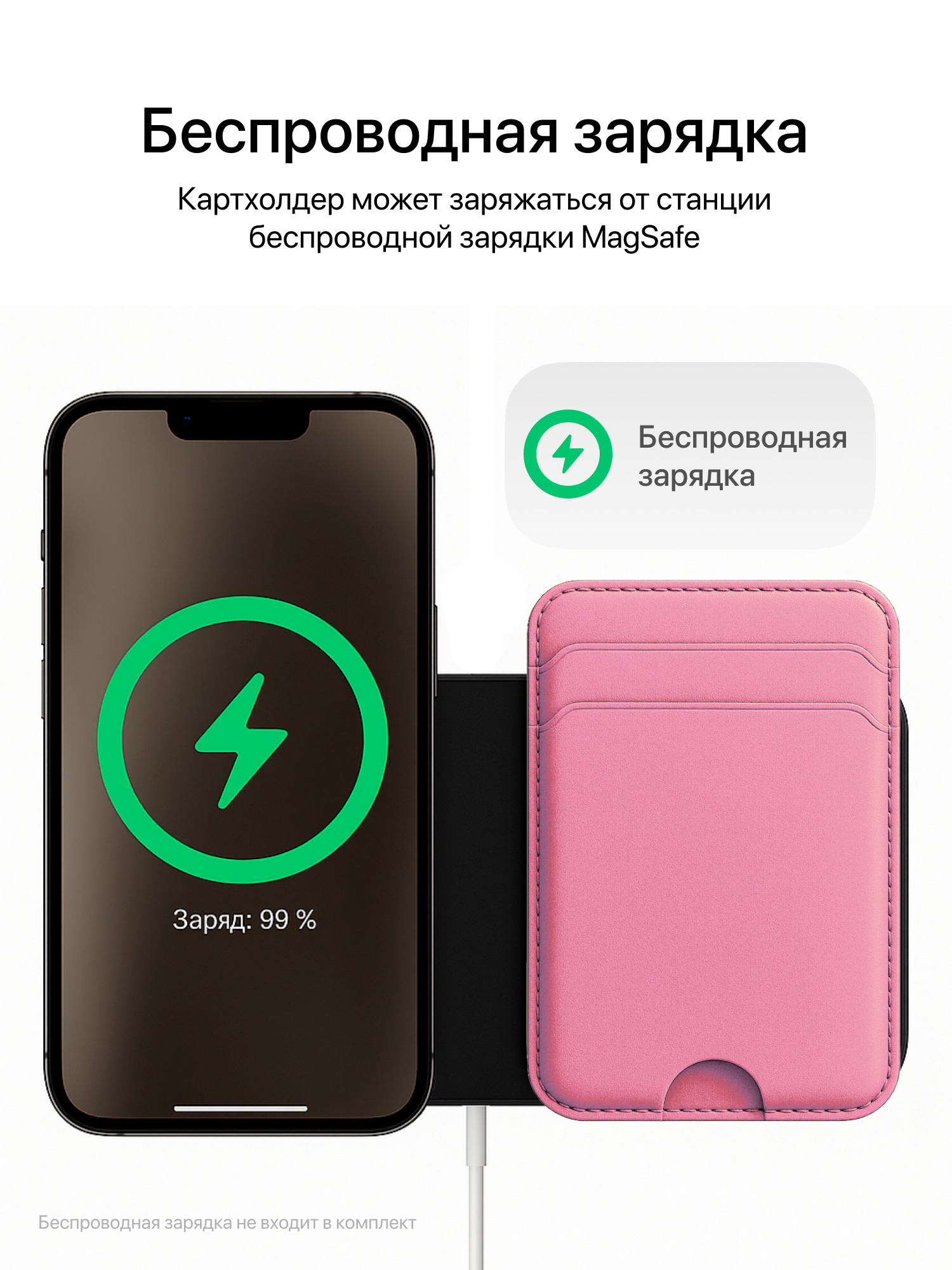 Встроенный аккумулятор заряжается от любой беспроводной зарядки.