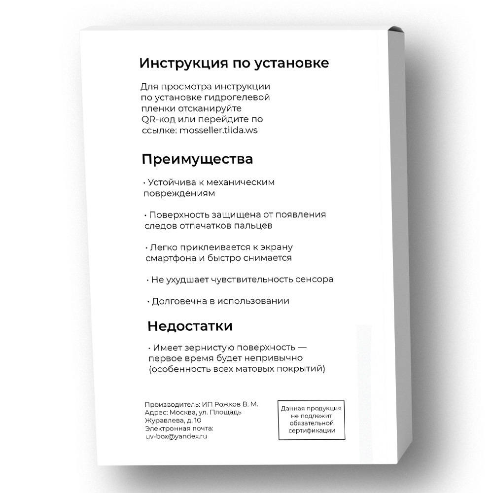 Гидрогелевая пленка 1шт; комплект для установки 1шт; фирменная паковка 1шт; ракель 1шт.