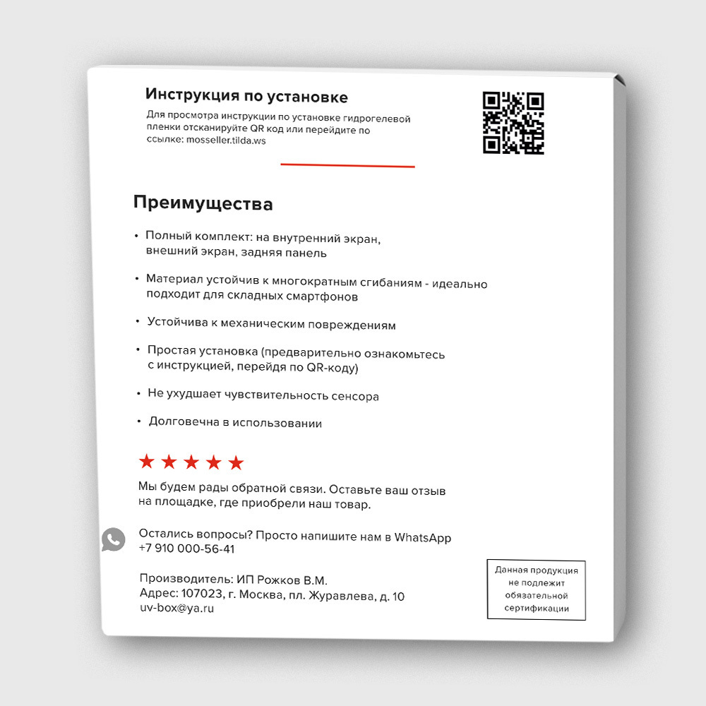 Комплект плёнок полностью соответствует модели смартфона Samsung Galaxy Z Fold 5. Защитите свой телефон от повреждений и продлите его срок службы с набором гидрогелевых плёнок Mosseller!